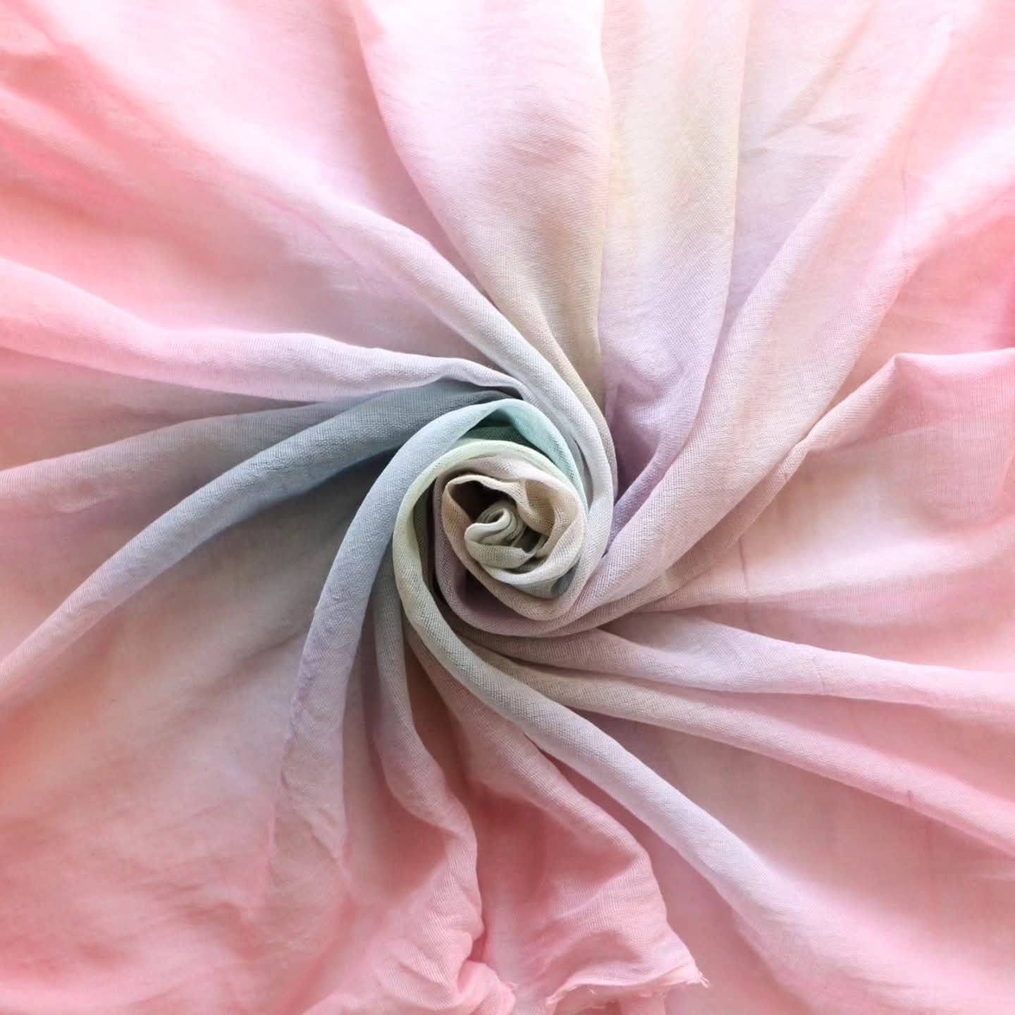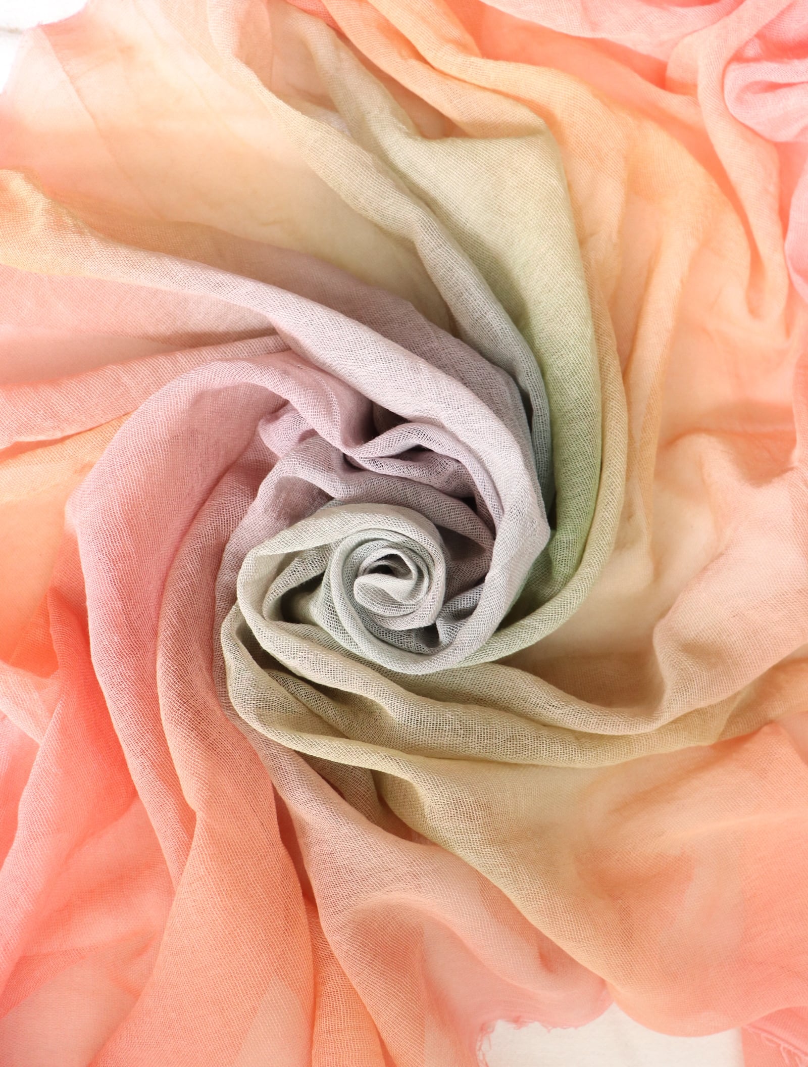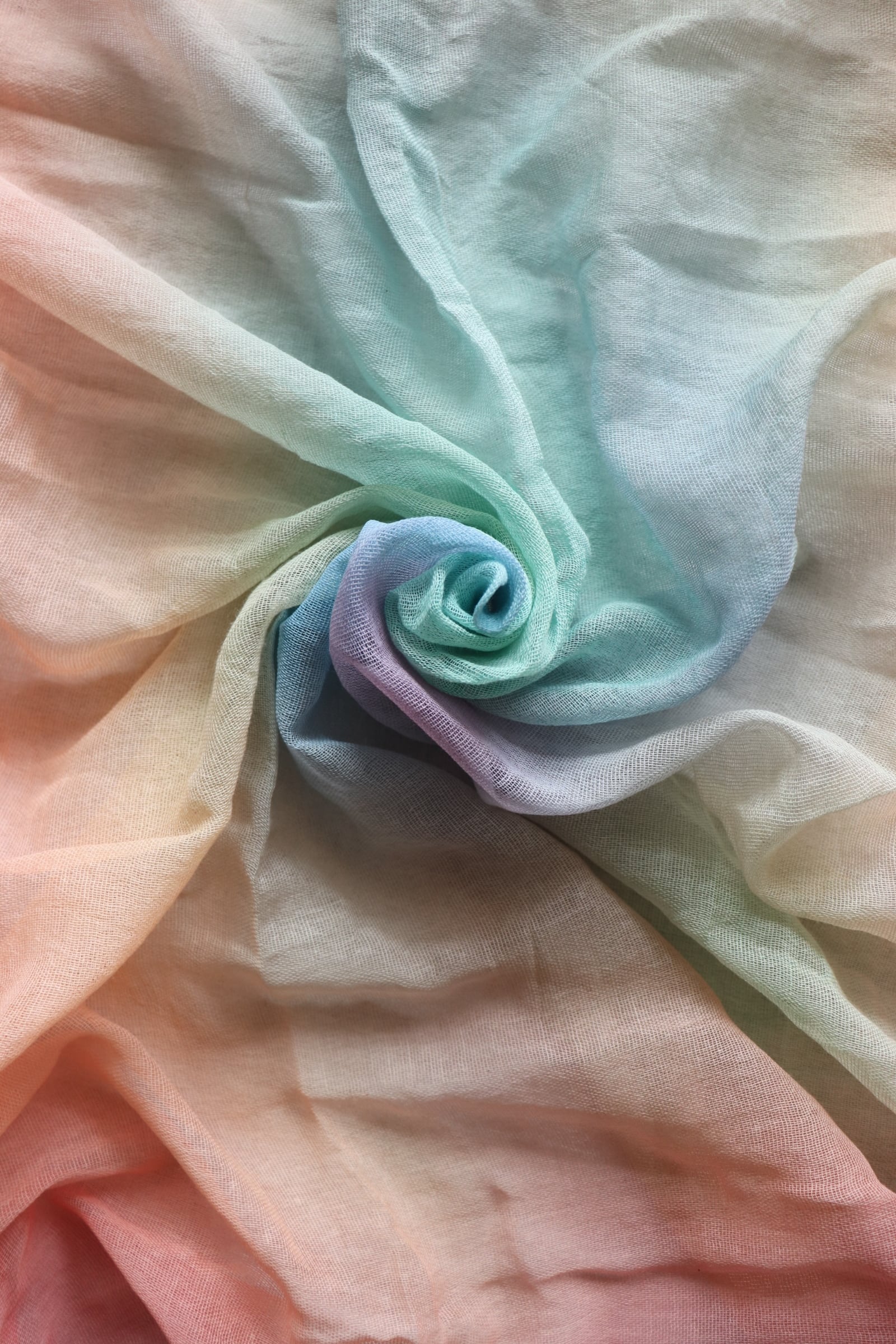 茜で染めた後、中央にあたたかな七色の光をグラデーション。中央のグラデーションはそれぞれ仕上がりが異なります。届いてからどんな光か楽しみにして下さい。