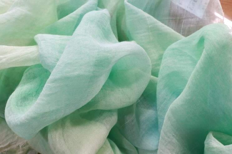 えんじゅを下染めした後、木陰の下から見る優しい光をイメージして布染料でグリーンのグラデーションを施していきます。